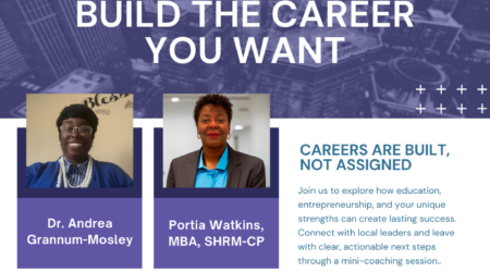 Join us for a high-impact session for women who are serious about owning their professional path. Dr. Andrea Grannum Mosley and Ms. Portia Watkins will explore how education, entrepreneurship, and your unique strengths can create lasting success. Connect with local leaders and leave with clear, actionable next steps through a mini-coaching session.